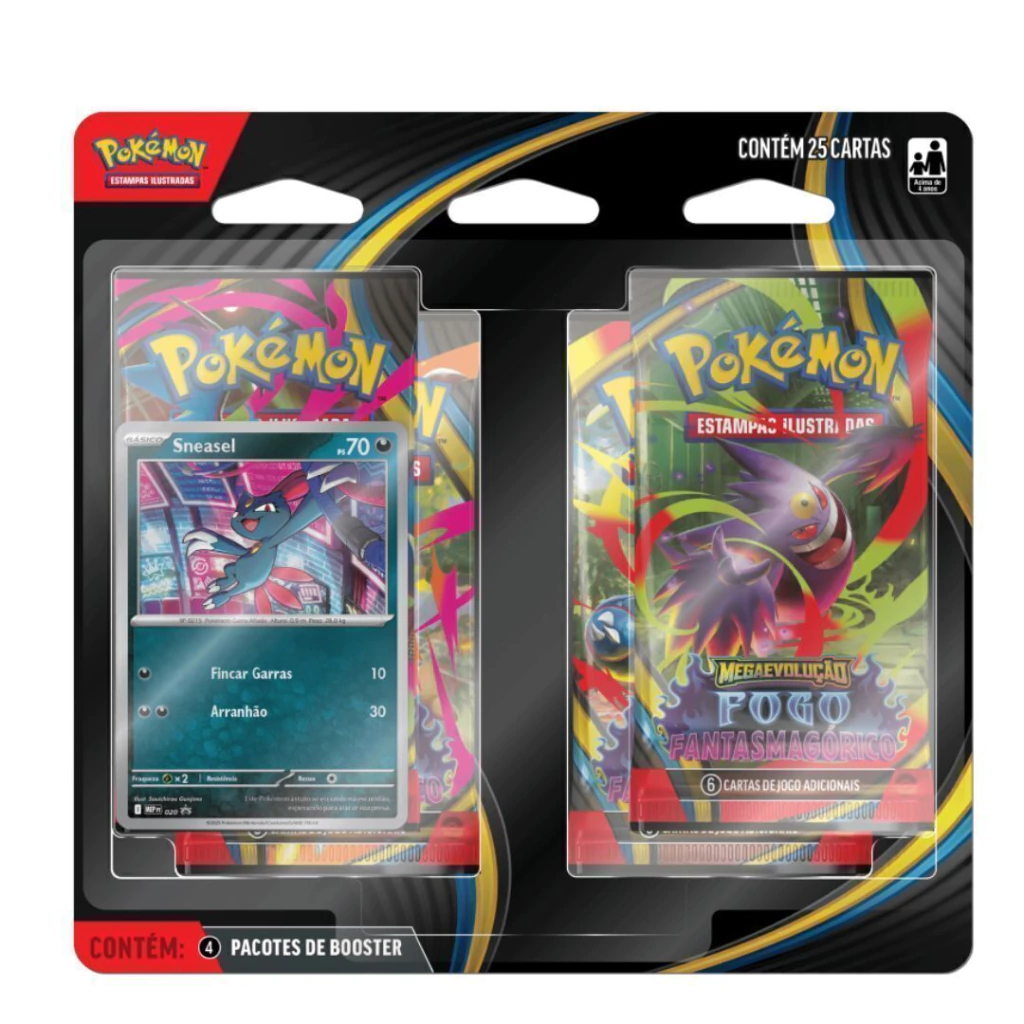 Liberte o poder das mega evoluções com o Blister Quádruplo Pokémon TCG ME02 – Fogo Fantasmagórico.