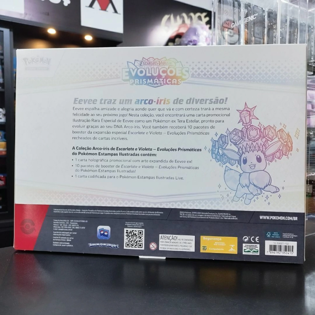 - Conteúdo: A box inclui uma carta promocional ilustração rara especial de Eevee como Pokémon ex Tera Estelar, 10 pacotes de booster da expansão Evoluções Prismáticas e uma carta codificada para o Pokémon Estampas Ilustradas Live. A coleção apresenta cartas holográficas promocionais exclusivas e boosters da série Evoluções Prismáticas, destacando Eevee e suas evoluções como Pokémon ex Tera Estelares.