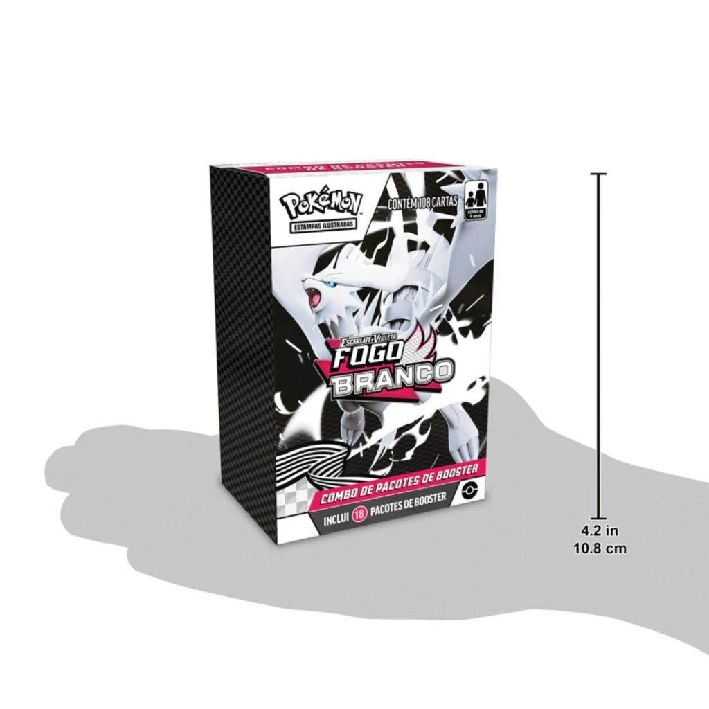 O Combo de Pacotes – Fogo Branco traz 18 boosters da edição especial Escarlate e Violeta 10.5, repletos de cartas brilhantes, Pokémon poderosos e estratégias de impacto!